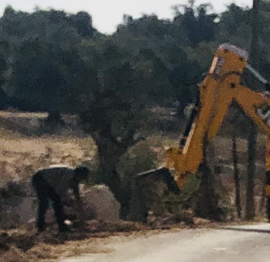 The photo above shows three such Arab construction workers, employed in rebuilding and renewing the security fence around the Israeli village. The old fence is old, rusted, and looks like it’s perhaps 30-40 years old. The new fence appears to be rust-proof steel, and sturdier. The workers are using heavy machinery to dig the post holes. Tomorrow, those post holes will be filled with concrete with the new posts stuck right in there as they harden.