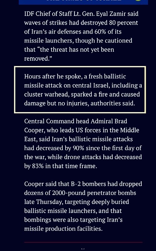 Allied forces have reduced missile attacks from Iran by 90%, and drone attacks down by 83%. Even so, at 10:50 last night, a cluster missile reached Israel, sending missiles to bomb shelters, and started a fire, no injuries.
