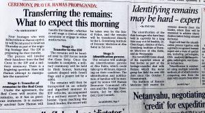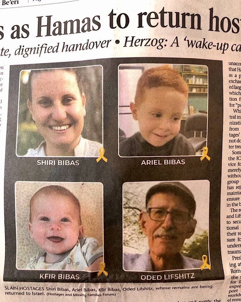 Posted on February 20, 2025February 20, 2025 by Teddy ChadwickBibas family plus one: Four bodies to return from GazaThe people of Israel weep as we learn that Oded Lifshitz (84) and the Bibas family will not return alive.Jerusalem Post, 2025-02-20 pg 1.Here are their photos:Jerusalem Post, 2025-02-20 pg 1.Pray for us, with Support.Source; . Jerusalem Post, 2025-02-20 pg 1.Share the post "Bibas family plus one: Four bodies to return from Gaza"Share…XRedditEmailEvernotePocketLinkedInPrintPost navigationPrevious PostPrevious Day 500: Professor quits University, blames anti-Israel biasNext PostNext Released terrorist falls off a roof to his death