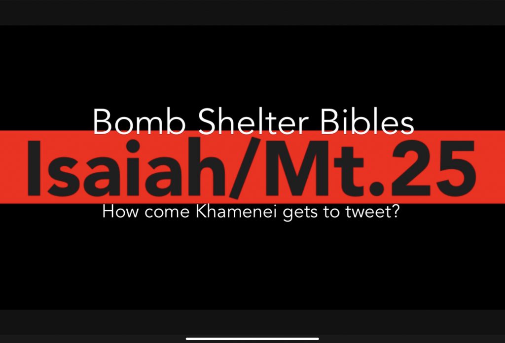 Isaiah/Mt25 & Khamenei’s Tweets Teddy Chadwick 6 years ago A look at Matthew 25 and Isaiah 25. Plus: Twitter loves to censor. So why not censor Khamenei? View in youtube Share the post "Isaiah/Mt25 & Khamenei’s Tweets" Share…XRedditEmailEvernotePocketLinkedInPrint