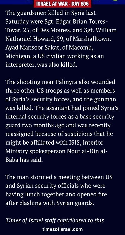 The shooting near Palmyra also wounded three other US troops as well as members of Syria’s security forces, and the gunman was killed. The assailant had joined Syria’s internal security forces as a base security guard two months ago and was recently reassigned because of suspicions that he might be affiliated with ISIS, Interior Ministry spokesperson Nour al-Din al-Baba has said.