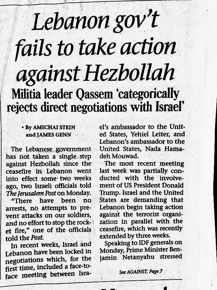 The Lebanese government has only paid lip service to the idea of reducing Hez — backed by Iran– from exterminating Jews from the north. After two weeks of ceasefire, the government has taken zero steps: