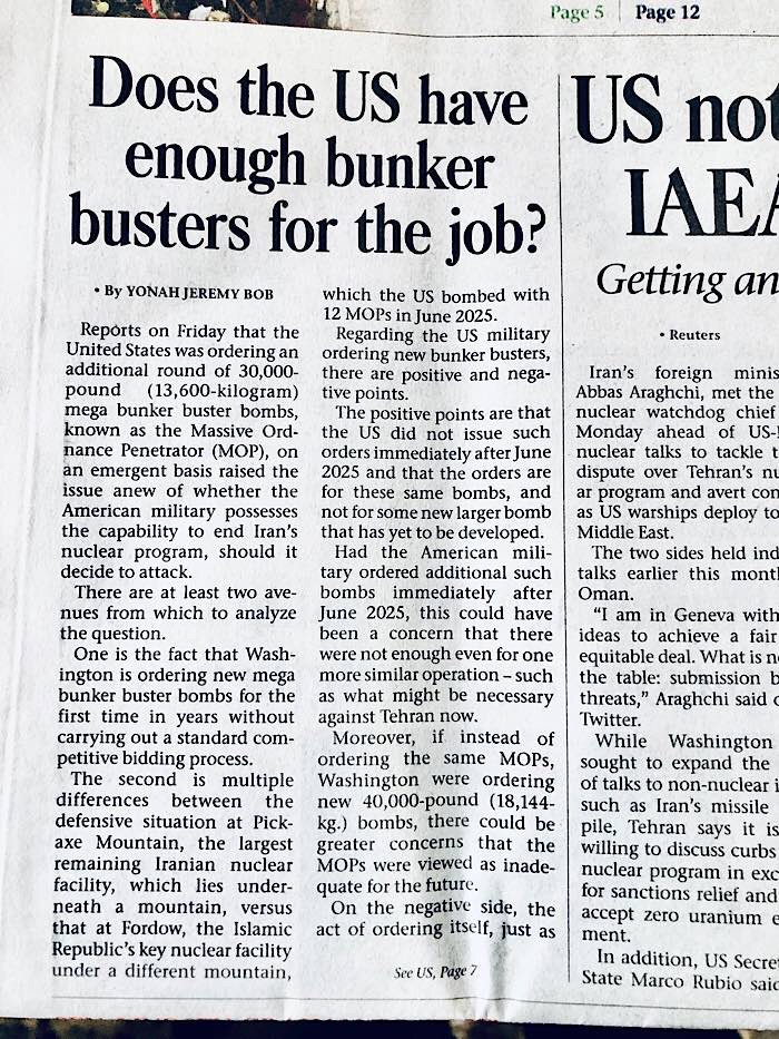 Sources: ¹Does the US have enough bunker busters to end Iran's nuclear program? - analysis https://www.jpost.com/international/article-886858 Related: ²US sends over 50 fighter jets to Middle East in military buildup against Iran https://www.jpost.com/middle-east/iran-news/article-886998